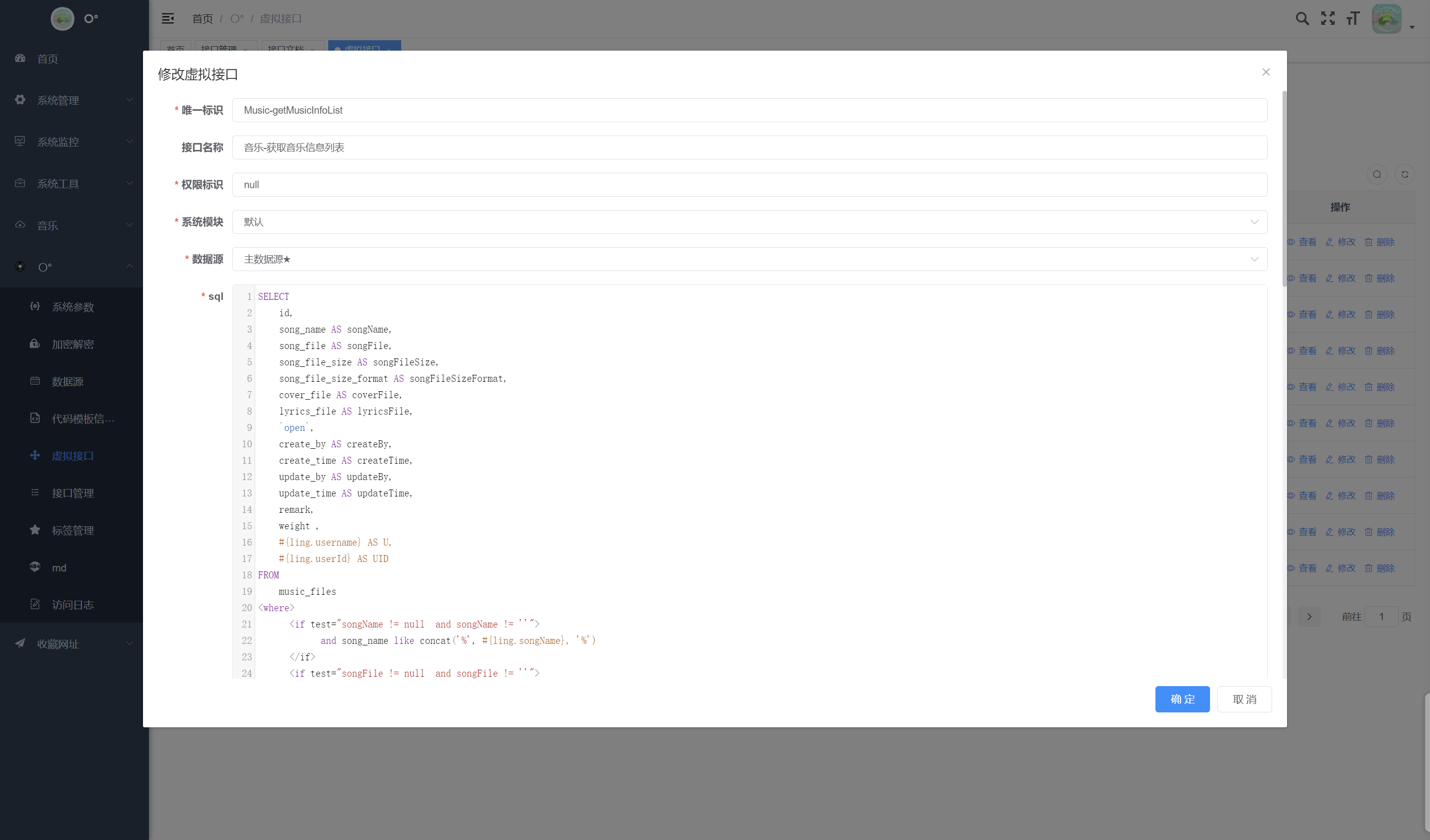 基于若依微服务的认证授权机制,在系统用户账号绑定一个密钥(出于安全考虑,密钥绑定了IP),这个密钥独立于账号登录,在项目系统模块启动后立即绑定认证信息及密钥到Redis,在本虚拟接口模块启动后立即将数据库中存有的虚拟接口相关SQL存储到Redis。 第三方系统想要调用本项目的接口会:创建账号->设置密钥->绑定IP->通知管理员授权->使用密钥+接口唯一标识访问接口。 虚拟接口的新建结合了若依微服务版中的BeanInvokeUtil工具以及Feign,使得其可灵活配置组合接口,比如在项目中有个业务是: