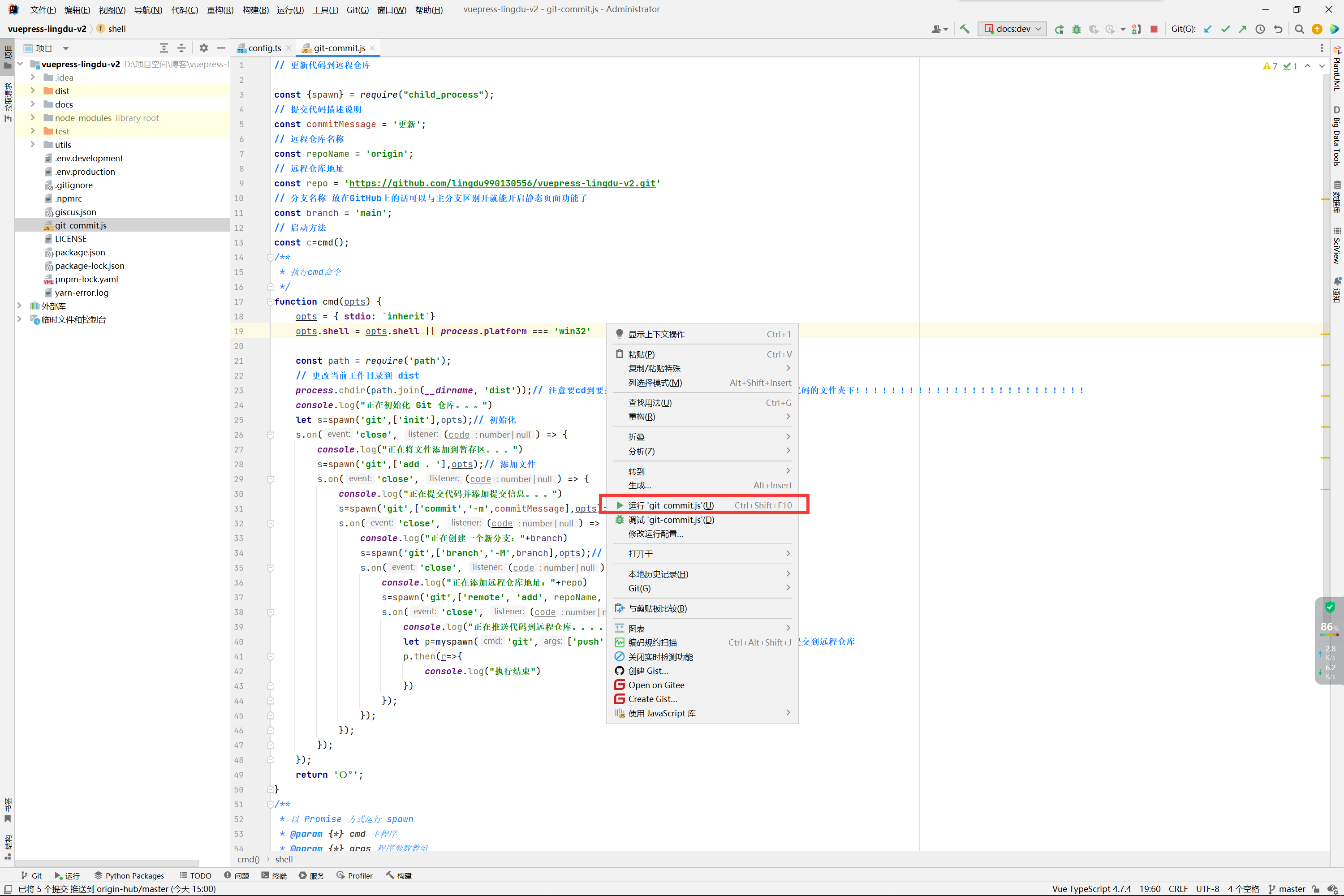 或者直接在git-commit.js中右击,然后点击运行