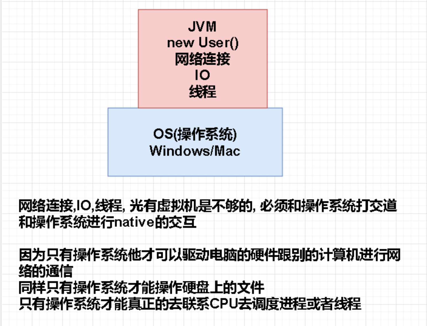 为什么说IO,连接都是非常真贵的资源? 我们知道,我们搞Java开发我们底层面临的是OS操作系统的资源,在它之 上我们构建了一个Java虚拟机的东西。我们写Java程序是运行在虚拟机层面上的东西,然后我们想要在虚拟机当中去 建立网络连接、或者是io、或者是线程的时候,这个时候虚拟机就办不到了,需要去沟通操作系统,因为只有操作系 统可以进行读取文件,可以去访问互联网,只有操作系统可以操作CPU操作线程、进程。所以,我们知道这些操作背 后都有操作系统,都会有这些native的方法的操作,而这些东西都是耗时和占用资源的,所以我们认为这些东西,必 须要关,必须要复用,必须要池化。