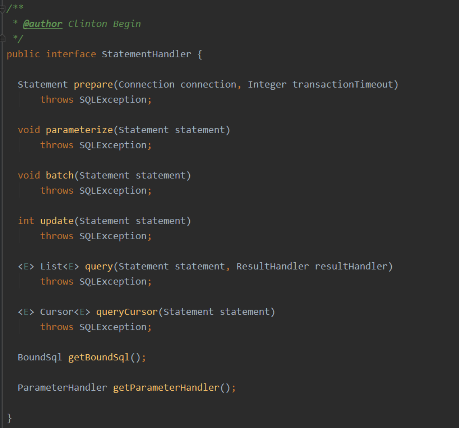 他直接与JDBC中的Statement建立联系(也可以理解为StatementHandler是对JDBC的Statement的封装)也就是说Executor 要完成操作(他也得用JDBC), 进而就会调用StatementHandler, 而StatementHandler里面封装了Statement, 进而就可以真 正的与数据库进行相关的联络和联系, 进而完成他的增删改查了