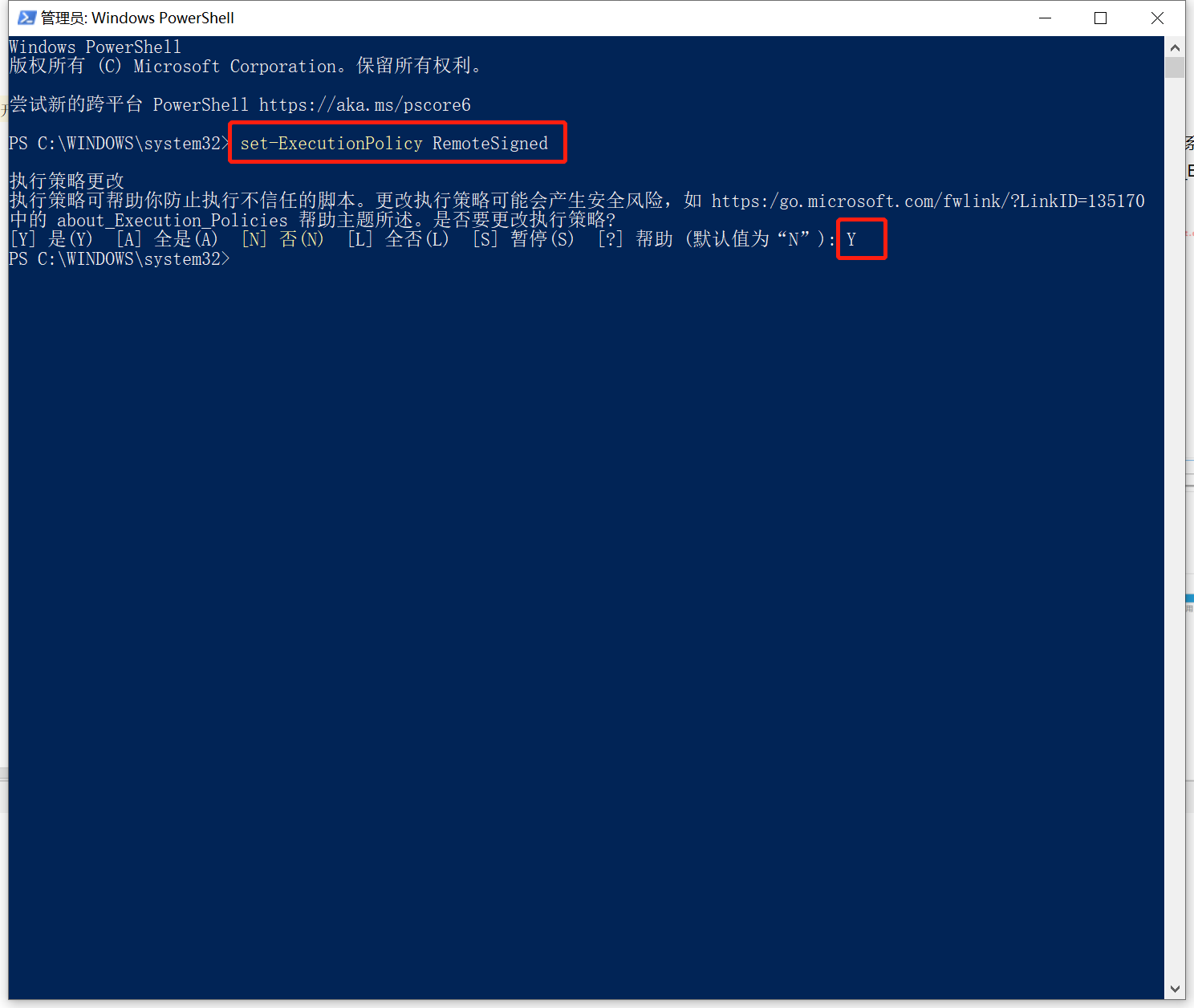 在本地计算机上运行您编写的未签名脚本和来自其他用户的签名脚本,使用以下命令将计算机上的 执行策略更改为 RemoteSigned